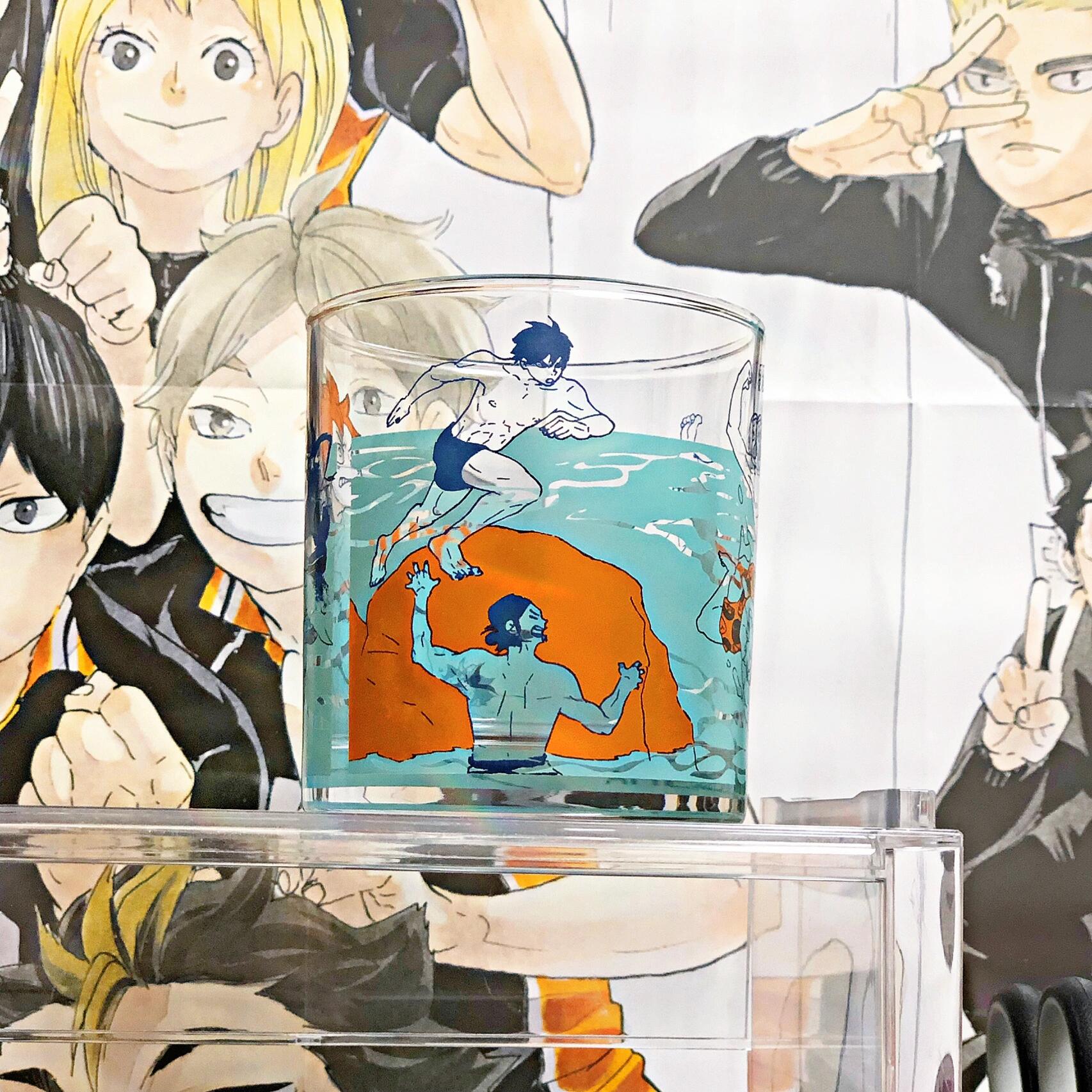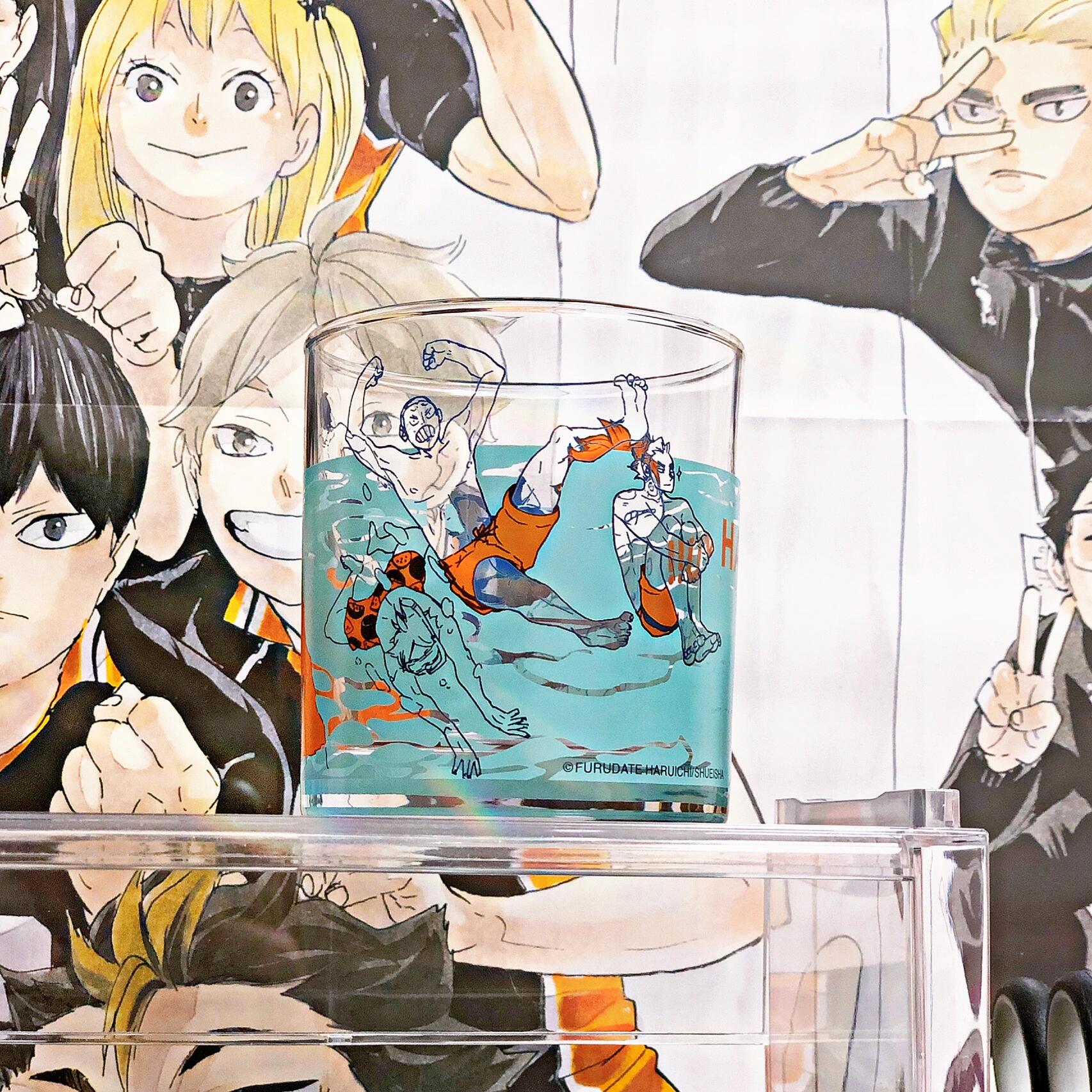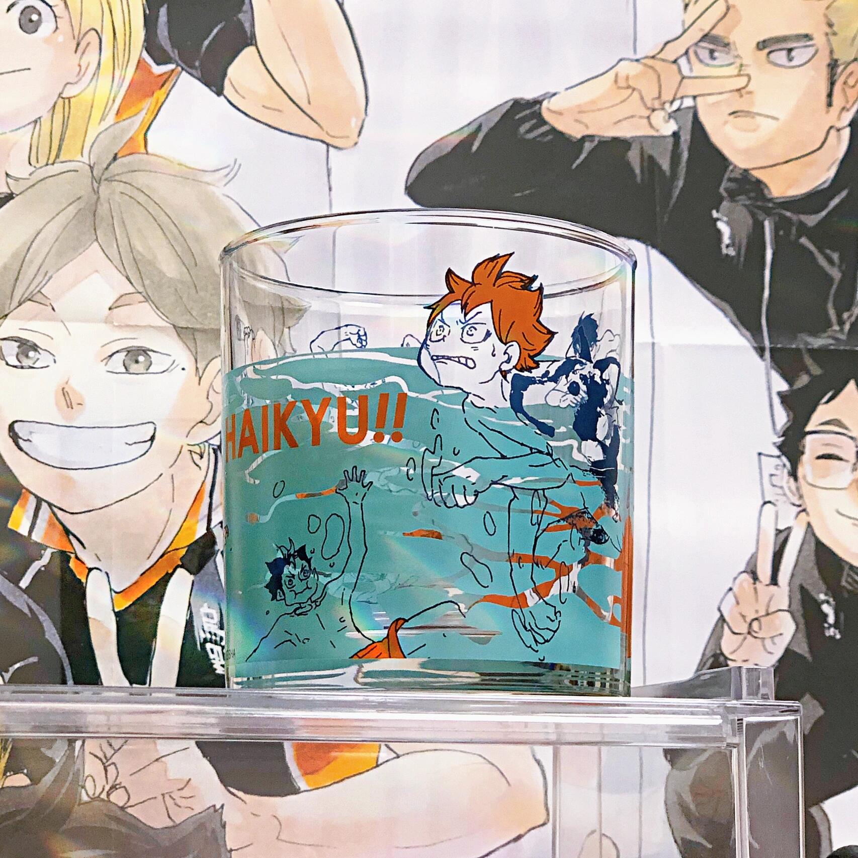 - ガラスカップの表面には、『ハイキュー!!』の代表的なキャラクターやシーン、例えば日向翔陽や影山飛雄など主要キャラクターのイラストや、バレーボール試合を象徴する要素がプリントされています。